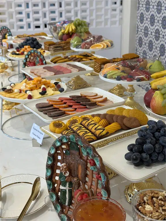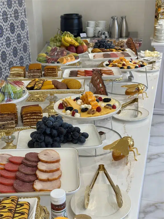 Завтрак в отеле Xorazm — это настоящий праздник вкуса и уюта. Гостей встречает обильный шведский стол с разнообразными блюдами на любой вкус. Свежие фрукты, ароматная выпечка, нежные йогурты, традиционные узбекские лепёшки и горячие блюда, приготовленные с любовью — всё это создаёт идеальное утро. Также в меню представлены яйца, приготовленные по вашему выбору, свежевыжатые соки, чай, кофе и местные деликатесы. Просторный и светлый зал с дружелюбной атмосферой делает завтрак особенно приятным началом дня.